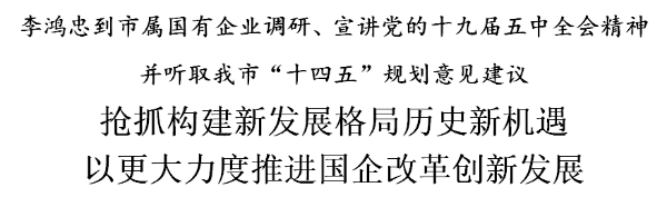 本報(bào)訊(記者 魏彧 于春灃)17日,市委書記李鴻忠深入市屬國(guó)有企業(yè)調(diào)研、宣講黨的十九屆五中全會(huì)精神,并聽取我市“十四五”規(guī)劃意見建議。李鴻忠強(qiáng)調(diào),要堅(jiān)持以習(xí)近平新時(shí)代中國(guó)特色社會(huì)主義思想為指導(dǎo),認(rèn)真學(xué)習(xí)貫徹黨的十九屆五中全會(huì)精神,深入貫徹新發(fā)展理念,搶抓構(gòu)建新發(fā)展格局歷史新機(jī)遇,找準(zhǔn)自身定位,毫不動(dòng)搖鞏固和發(fā)展公有制經(jīng)濟(jì),以更大的力度推動(dòng)國(guó)企改革創(chuàng)新發(fā)展,切實(shí)促進(jìn)國(guó)有企業(yè)不斷做強(qiáng)做優(yōu)做大。